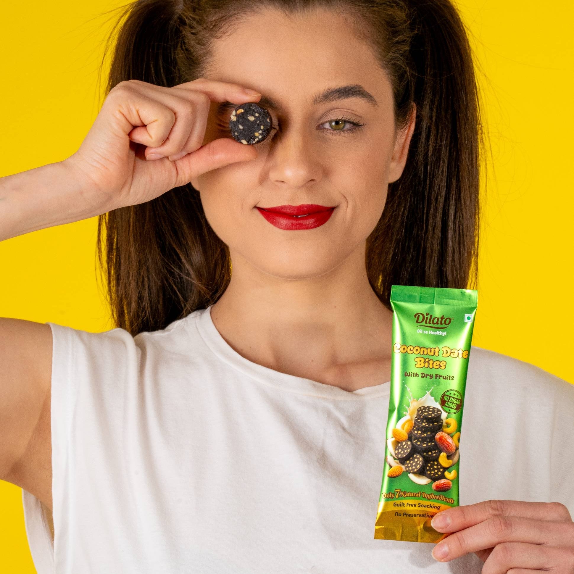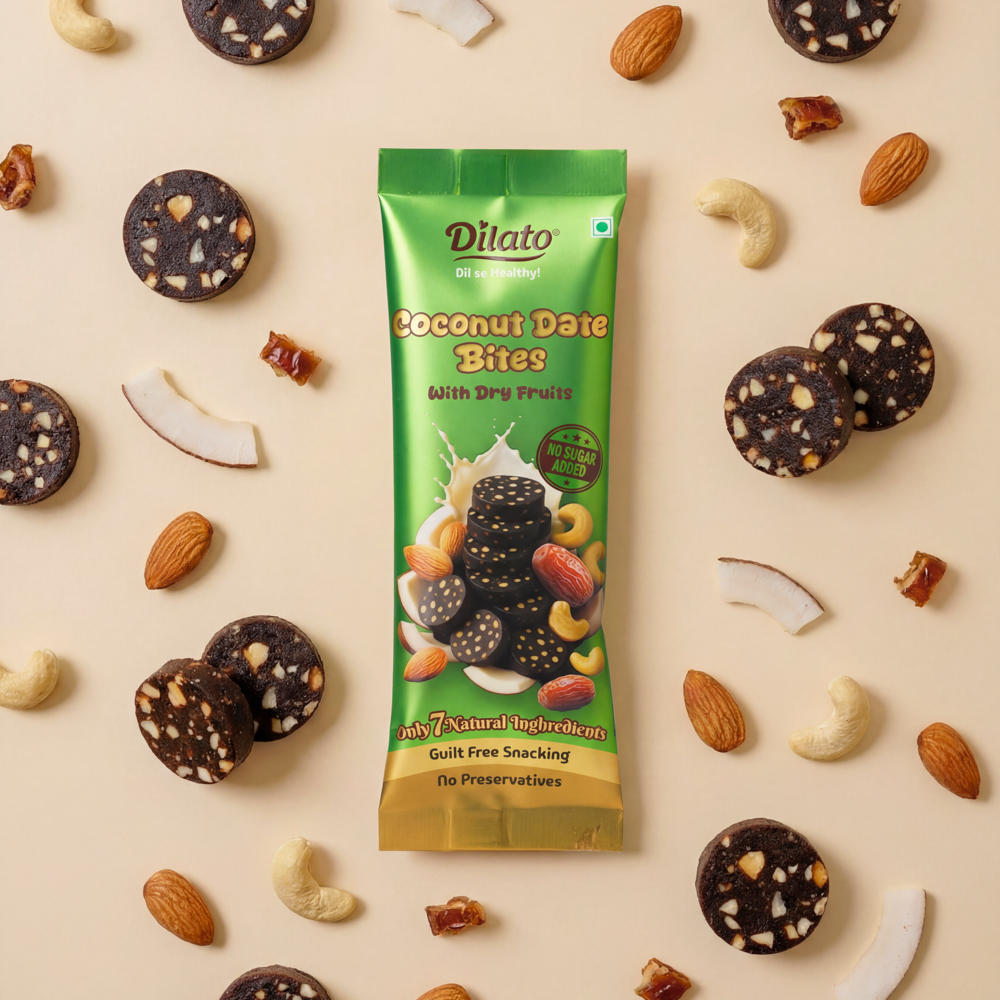 Delicious coconut date bites crafted with naturally sweet dates and coconut, blended with dry fruits, for a soft, chewy texture and rich flavour. Perfect for a quick snack, dessert cravings, post or pre-workout bite, or on-the-go moments. Conveniently packaged to have while travelling, in the office, in school, just anywhere!